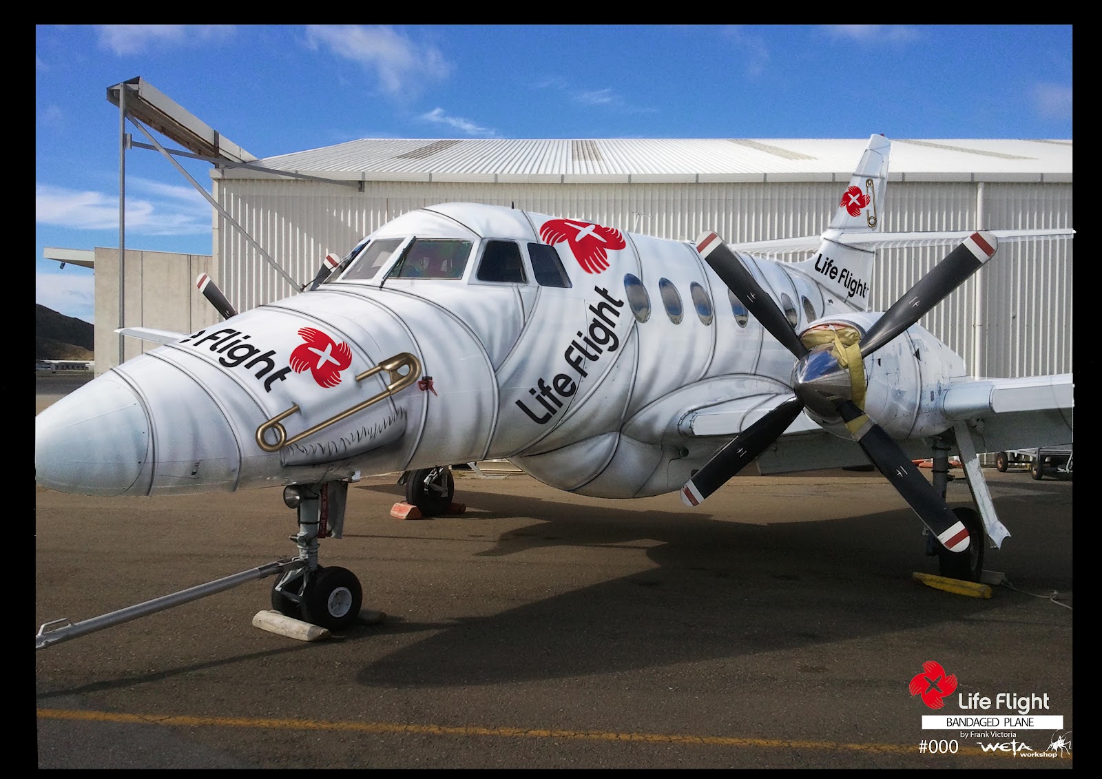The Life Flight trust in Wellington asked us at Weta Workshop to come up with a crazy design ideas for their plane. We gave them something like 30 to 40 different options. They picked one of mine: The Bandaged Plane. I’m really impressed with how well it looks in the end! The top image is a photoshop job, the second: a schematic of how it should be applied, and the last two are actual photos of the plane.